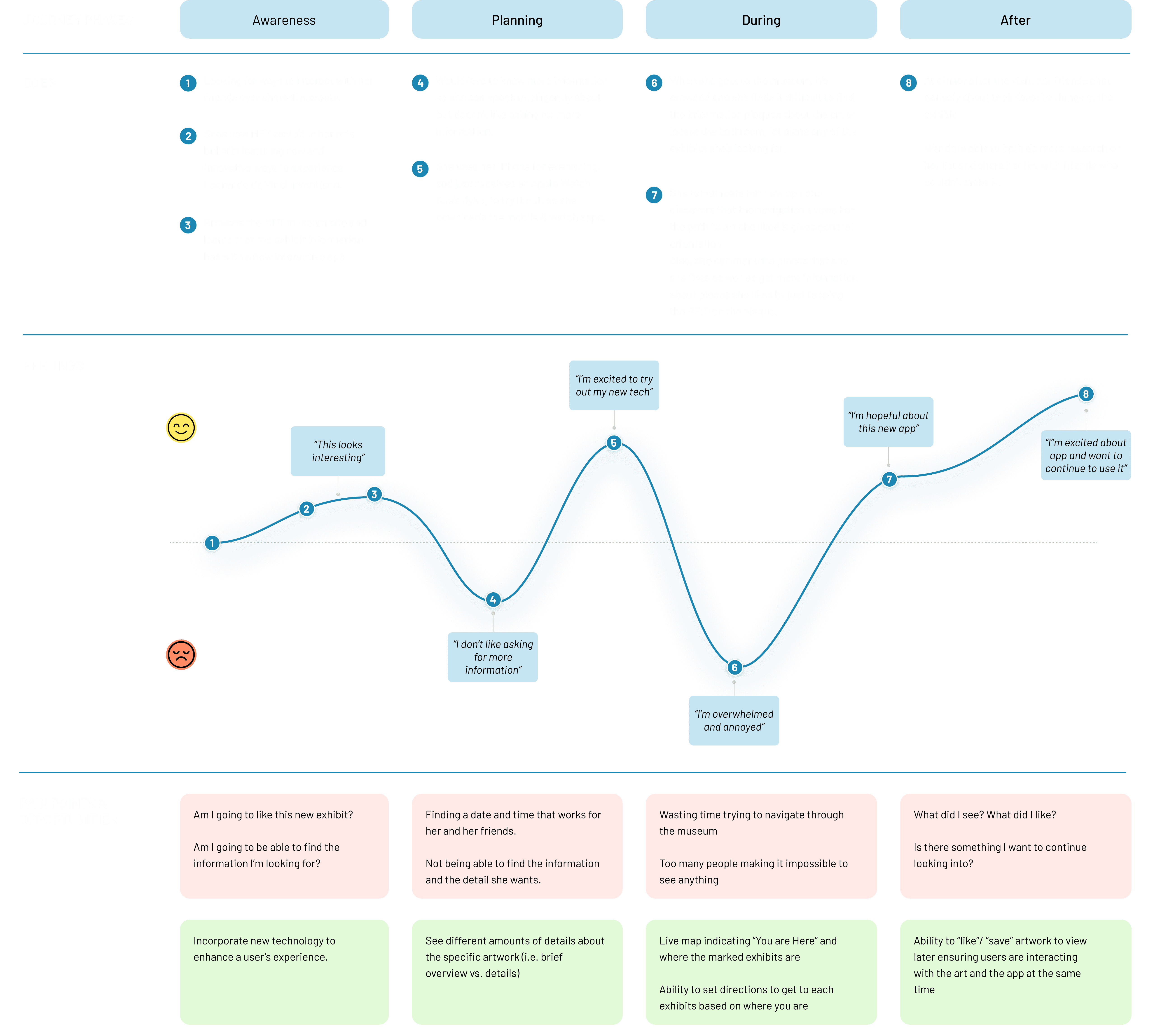 We created a user journey map to better understand what motivates our users and identify where in the in the experience our users are experiencing pain points.