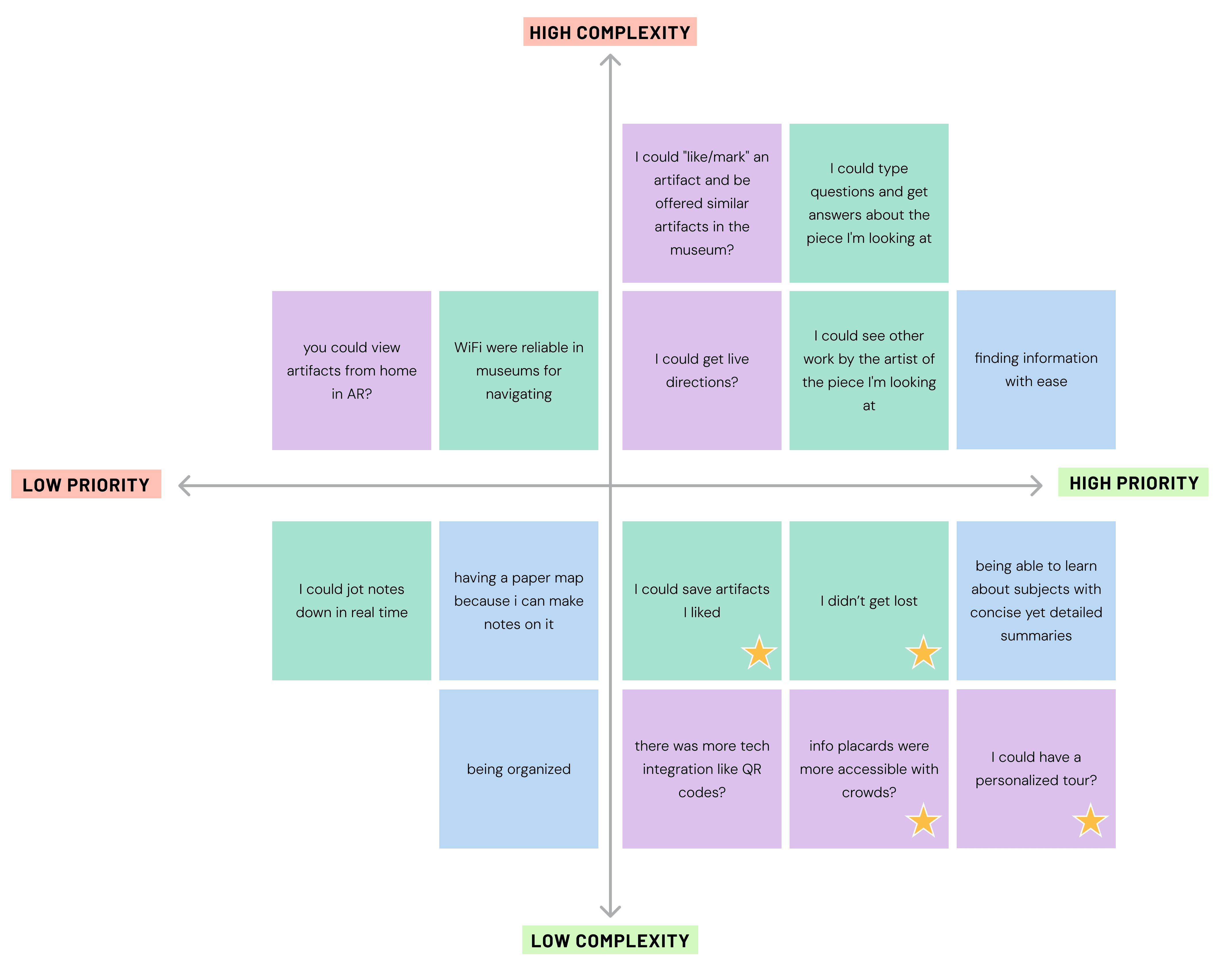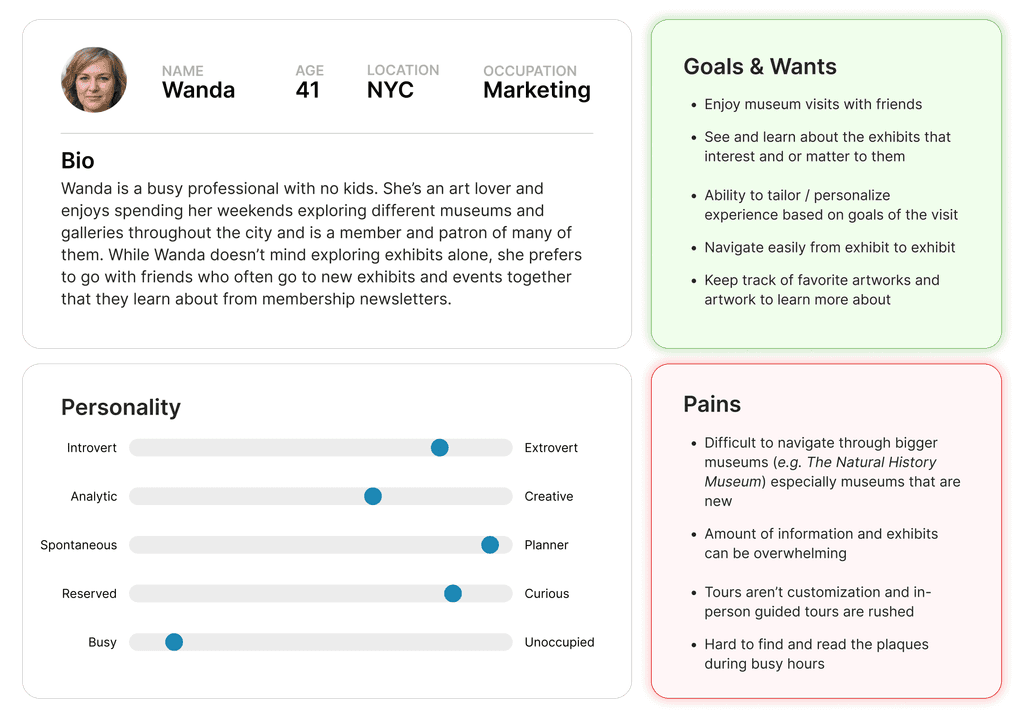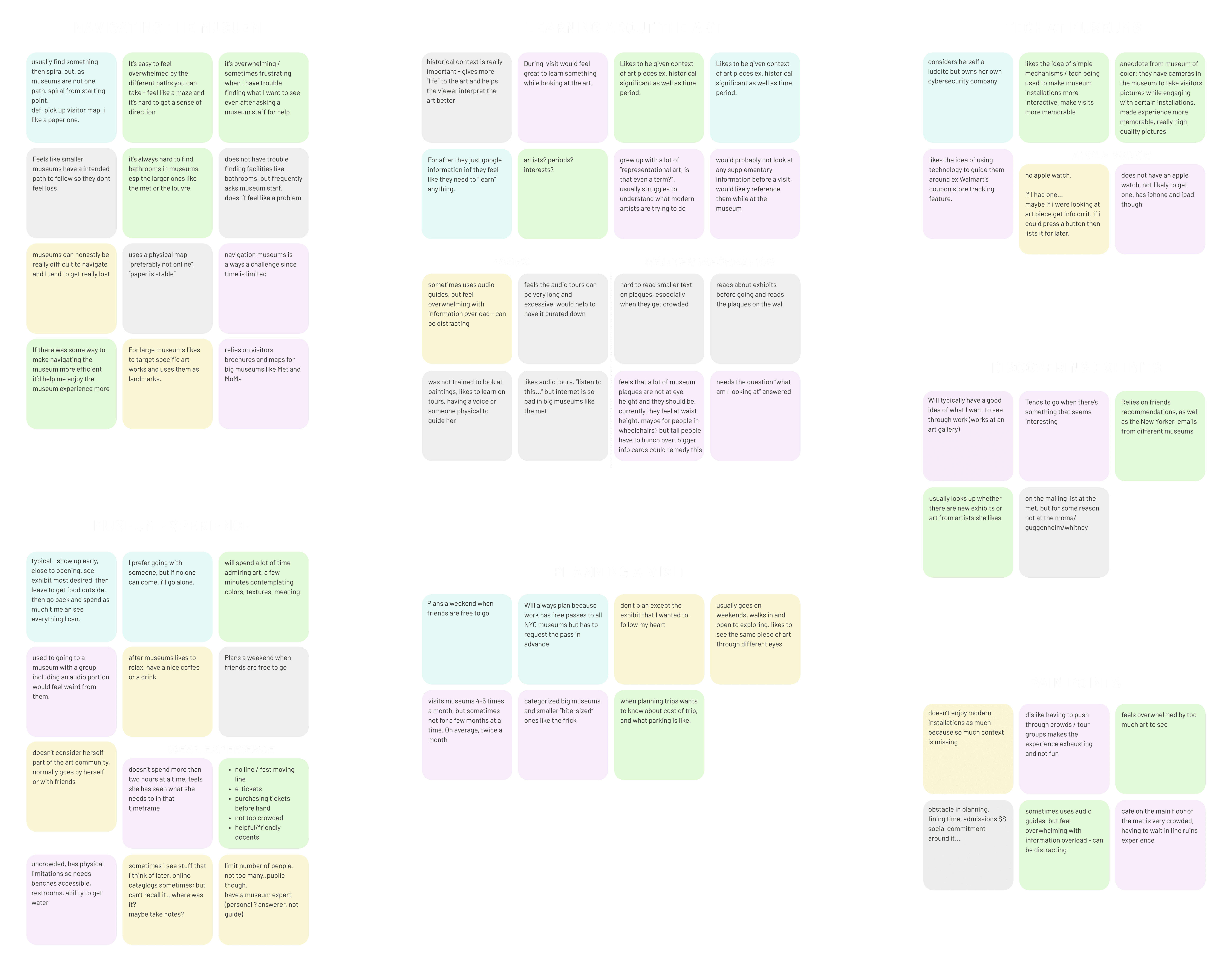 We observed that museum visitors often want to see specific exhibits/artwork and learn but feel like 1) information isn’t accessible, 2) museums are overwhelming and difficult to navigate. How might we improve the museum experience so visitors feel more oriented and presented information in a more engaging, accessible, interactive, and personalized experience?
