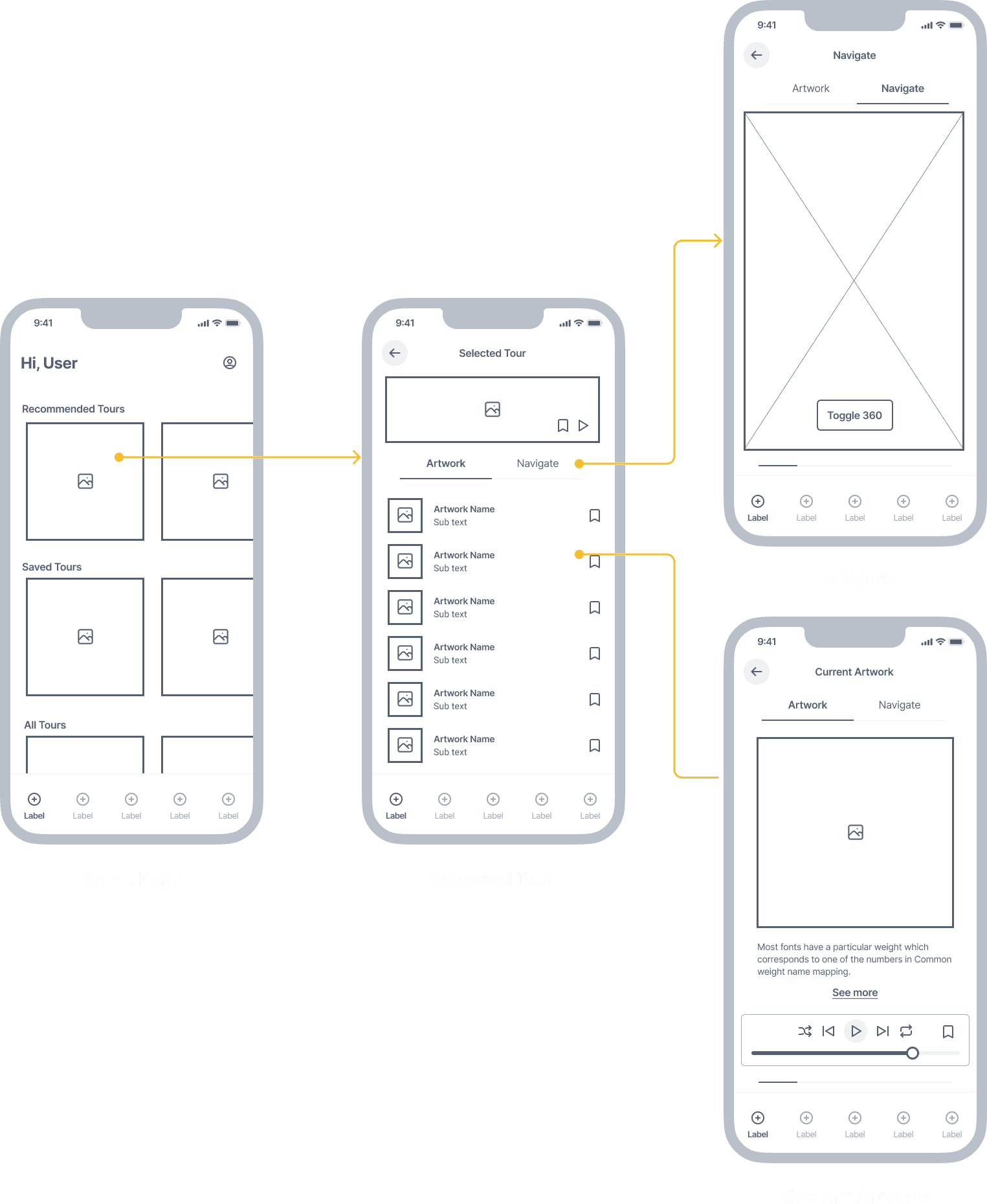 The following wireframe follows the task of a mobile user playing a curated tour and tested our product’s usability